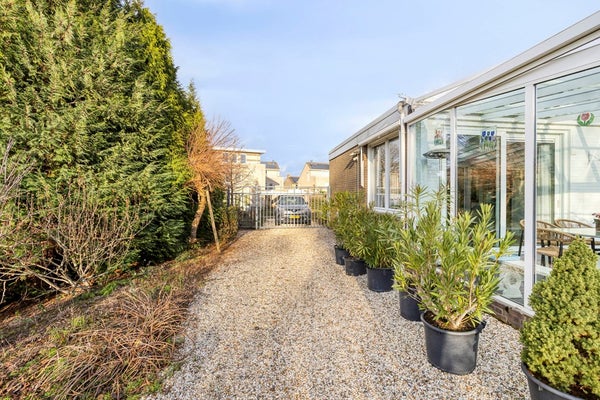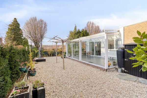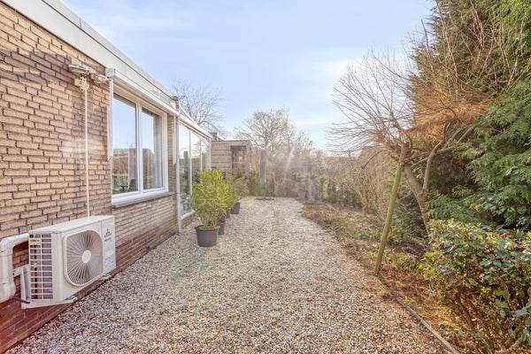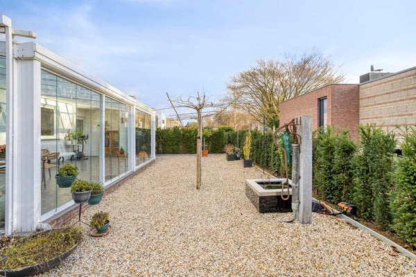 De sfeervolle, onderhoudsvriendelijke tuin is bereikbaar via de schuifdeuren in de serre en via het poortje aan de zijkant van de woning. De tuin is voorzien van veel grindpaden, is volledig omsloten en biedt optimale privacy. De tuin is ingericht met een combinatie van volwassen beplanting en verzorgde plantenborders. Tevens is er een regenwaterafvoer met filter aanwezig, onderdeel van een regenwateropvangsysteem. Hier geniet u in alle rust van een beschutte buitenruimte met een prettig gevoel van privacy en comfort, ideaal voor ontspanning in elk seizoen.