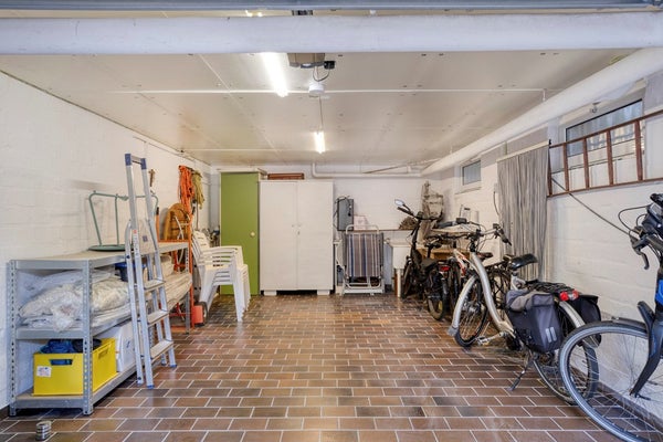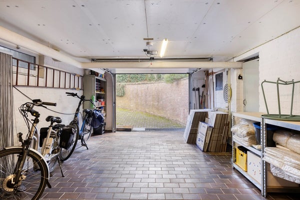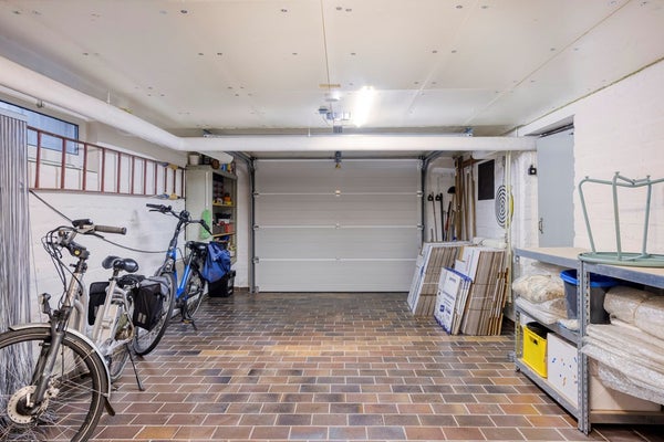• Garage: De ruime, betegelde garage heeft een oppervlakte van circa 29 m² en is bereikbaar via het souterrain of via de elektrisch bedienbare kantelpoort aan de opritzijde. De garage is voorzien van elektra en biedt volop ruimte voor het parkeren van een voertuig en/of het opslaan van fietsen, tuinmeubilair en andere spullen.