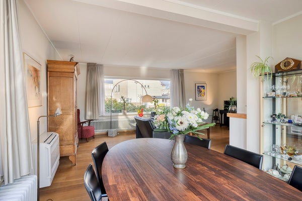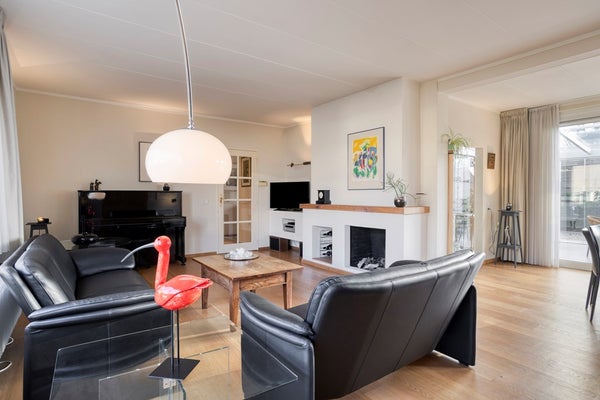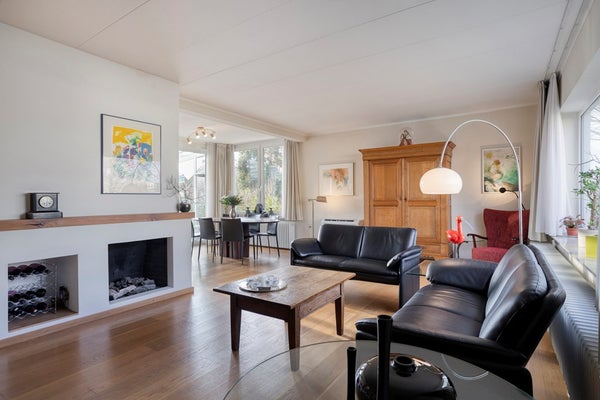 De royale woon- en eetkamer heeft een oppervlakte van circa 40 m² en is afgewerkt met een sfeervolle eikenvloer. De centraal geplaatste haard vormt een echte blikvanger en draagt bij aan de warme en gezellige ambiance. Dankzij de vele raampartijen en de grote schuifpui geniet deze ruimte van een fraaie natuurlijke lichtinval en een directe verbinding met de serre. Tevens is de woonkamer voorzien van comfortabele airconditioning.