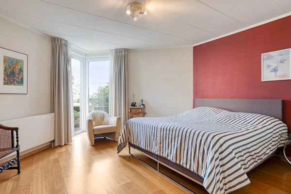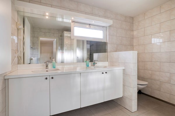 De eerste en tevens grootste slaapkamer bevindt zich eveneens op de begane grond en heeft een oppervlakte van circa 20 m². Deze slaapkamer is voorzien van ingebouwde kasten en beschikt over een eigen, goed onderhouden badkamer ensuite van circa 6 m². De badkamer is volledig betegeld en ingericht met een ligbad met douche, een wastafelmeubel met dubbele wasbak en een handdoekradiator.