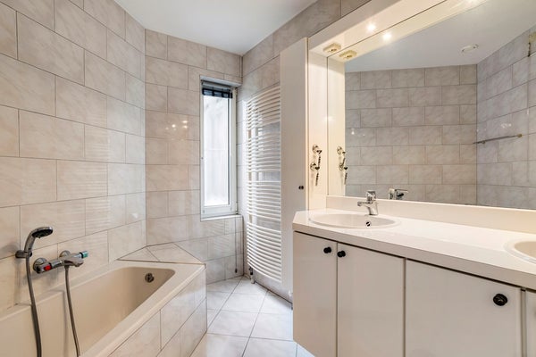 • Badkamer: De ruime, betegelde badkamer is ca. 8 m² groot en uitgerust met een inloopdouche met infrarood paneel, een wastafelmeubel met dubbele wasbak en een hangcloset.