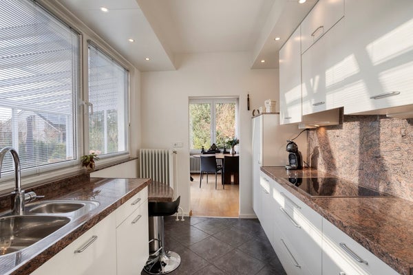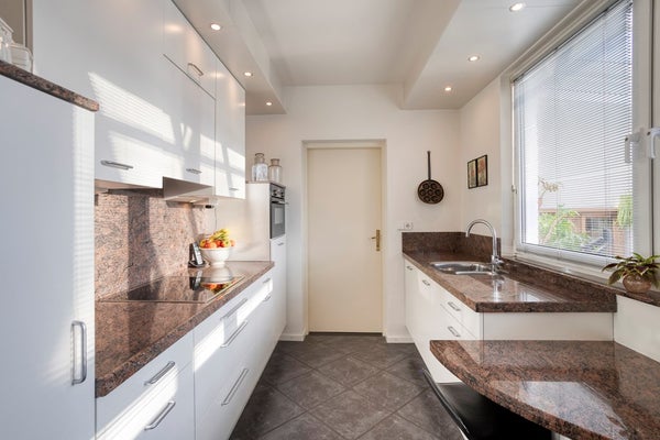 Aansluitend bereikt u de keuken van circa 8 m². Deze keuken verkeert in uitstekende staat en is voorzien van een marmeren werkblad, achterwand en dito zitje. De keuken is uitgerust met diverse inbouwapparatuur, waaronder een keramische kookplaat, afzuigkap, combi-oven, vaatwasser en koelkast.
