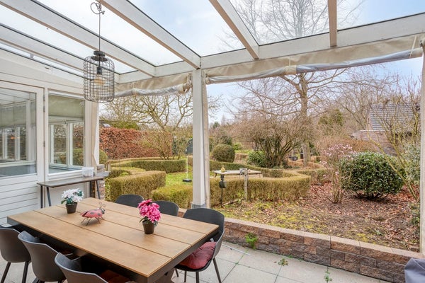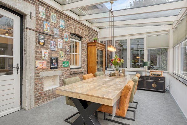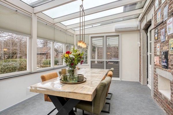 Grenzend aan de woonkamer en keuken ligt de lichte tuinkamer/veranda van ca. 19 m². Dankzij de grote raampartijen geniet u hier van een aangename lichtinval en een fraai zicht op de achtertuin, bovendien is deze kamer voorzien van airconditioning: een heerlijke plek om in alle seizoenen te ontspannen.