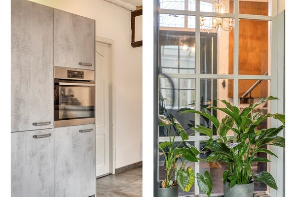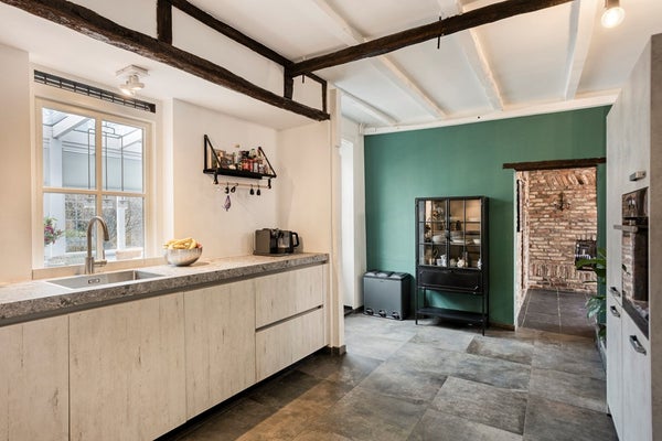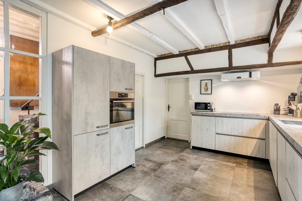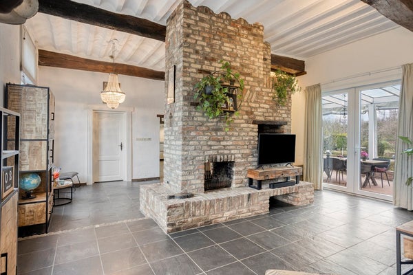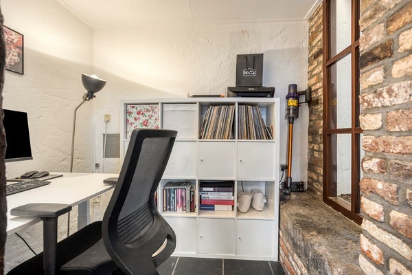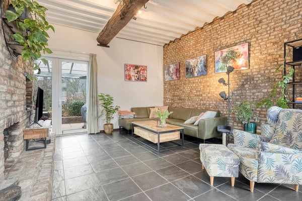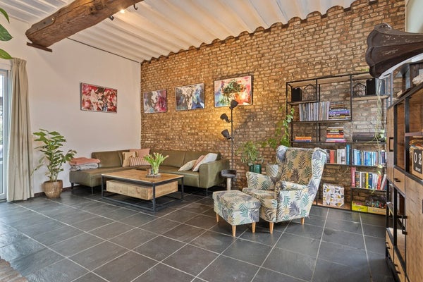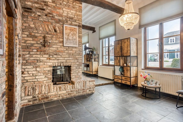 De sfeervolle woonkamer van ca. 43 m² vormt het warme hart van de woning. Een open haard, antieke plafondbalken en veldbrandstenen muren geven de ruimte een uniek en authentiek karakter. Bijzonder zijn de nog aanwezige hardstenen voederbakken, originele elementen die het historische verhaal van het pand tastbaar maken. Vanuit de woonkamer is bovendien een extra ruimte van ca. 5 m² bereikbaar, momenteel ingericht als kantoor, maar flexibel in te delen naar eigen wens, bijvoorbeeld als werk-, speel- of hobbyruimte.