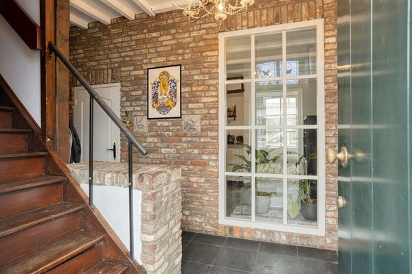 Bij binnenkomst wordt u direct verwelkomd door de historische sfeer van de woning. De voordeur is omlijst met authentieke Naamse steen en een antieke dorpel, waardoor de rijke historie meteen voelbaar is. De royale hal van ca. 11 m² is afgewerkt met een leistenen tegelvloer en biedt toegang tot de meterkast, de woonkamer, de keuken, de toiletruimte, de bijkeuken en de karaktervolle trap naar de eerste verdieping.
