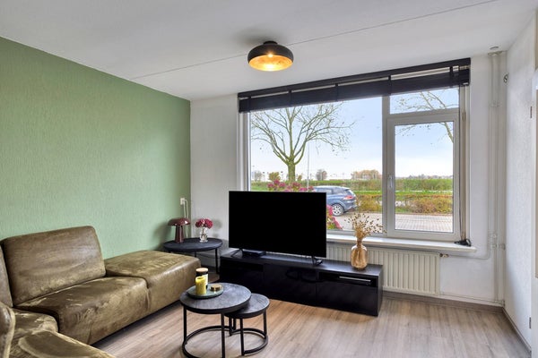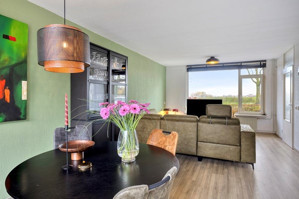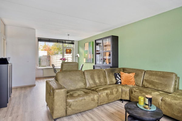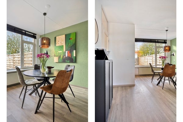 De woonkamer met semi-open keuken beslaat ca. 33 m² en heeft een warme, uitnodigende uitstraling. De doorgelegde laminaatvloer zorgt voor een moderne eenheid in de ruimte. Grote ramen aan zowel de voor- als achterzijde zorgen voor een uitstekende lichtinval en creëren een prettige, lichte leefomgeving.