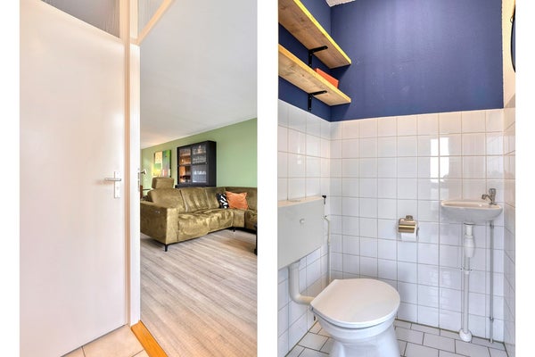 U betreedt de woning via de lichte entree, voorzien van een nette tegelvloer. Vanuit hier heeft u toegang tot de meterkast, de volledig betegelde toiletruimte met staand closet en fonteintje, en de woonkamer met semi-open keuken.