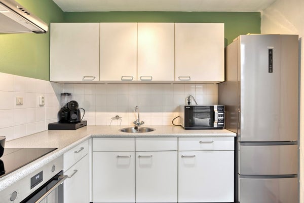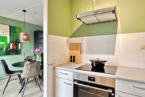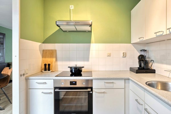 De keuken is aan de achterzijde van de woning gesitueerd en uitgevoerd in een verzorgde L-opstelling. De keuken beschikt over een elektrische kookplaat, afzuigkap en een oven. Vanuit de keuken bereikt u de bijkeuken (ca. 5 m²), met witgoedaansluitingen en extra bergruimte. De bijkeuken biedt directe toegang tot de achtertuin, waardoor binnen- en buitenleven op een natuurlijke manier met elkaar verbonden zijn.