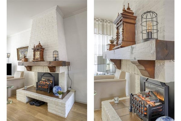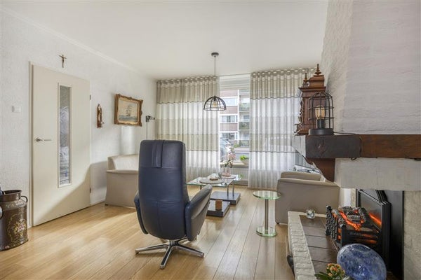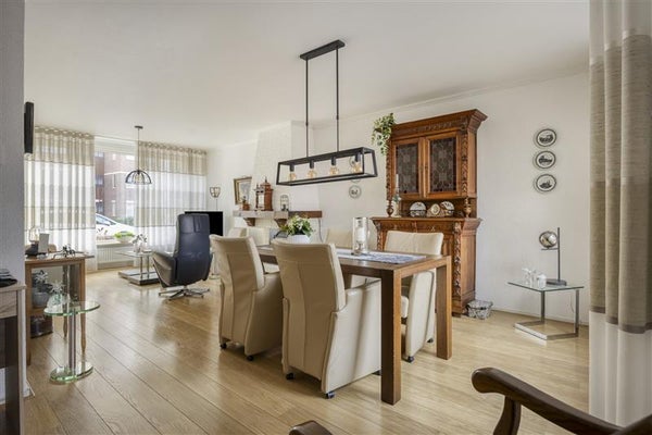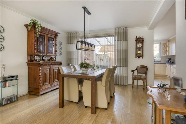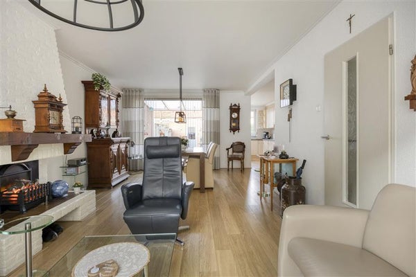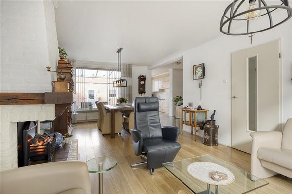 -Ruime gezinswoning met keuken in de uitbouw, lichte woonkamer met grote raampartijen en een sfeervolle haard, plus een serre aan de achterzijde