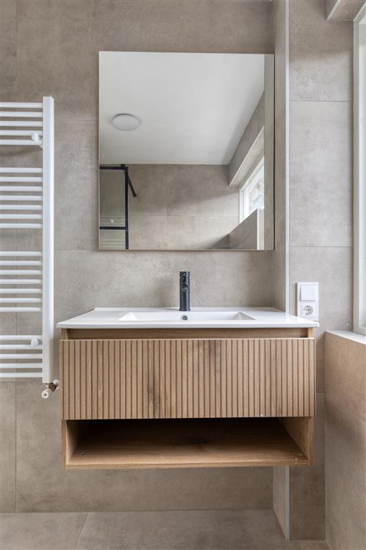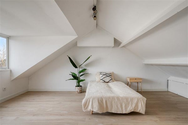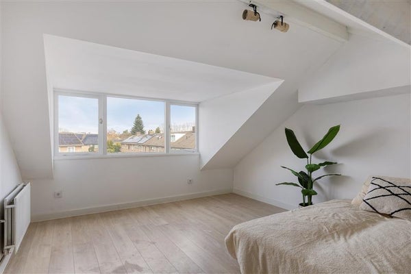 De zolderverdieping vormt een volwaardige uitbreiding van het woonprogramma. Dankzij de dakkapel is hier een ruime vierde slaapkamer gerealiseerd. Het daglicht valt ruim binnen en vergroot het ruimtelijk effect. De voorzolder is ingericht als wasruimte, waarmee praktische voorzieningen uit het zicht zijn georganiseerd.