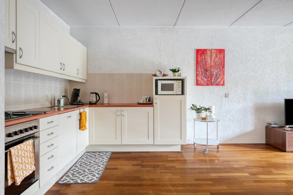 De open keuken is voorzien van een 4-pits gaskookplaat, oven, vaatwasser en koelkast.