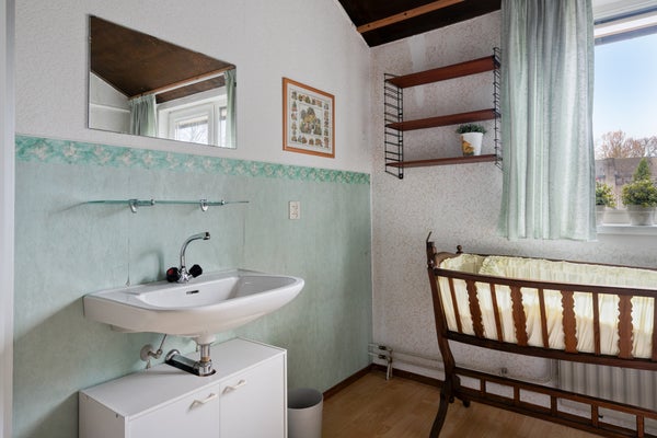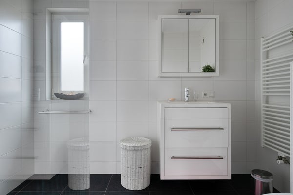 De badkamer bevindt zich aan de voorzijde en is voorzien van een inloopdouche, wastafelmeubel, hangcloset, draai-kiepraam en designradiator. De ruimte is in 2009 vernieuwd.