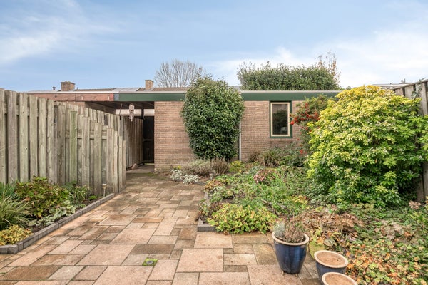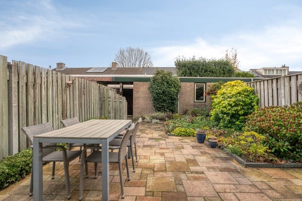 De achtertuin is netjes onderhouden en bereikbaar via een schuifpui die aan twee zijden geopend kan worden. In de tuin is een buitenkraan aanwezig. Achterin bevindt zich een schuurtje met elektra en een raam met dubbel glas. De tuin beschikt over een achterom.