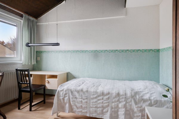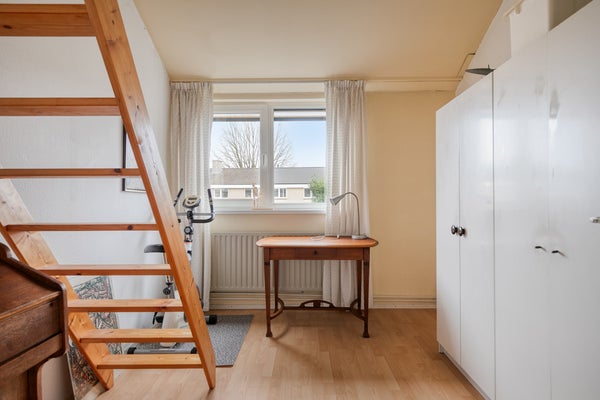 De tweede slaapkamer aan de achterzijde beschikt over een dubbel raam met handbediende zonwering en heeft eveneens opbergruimte richting de vliering.