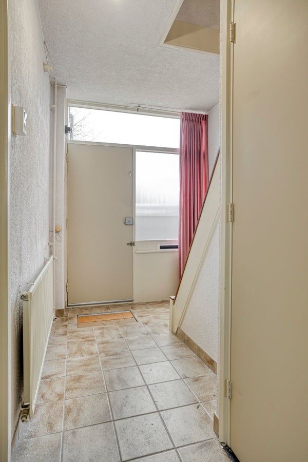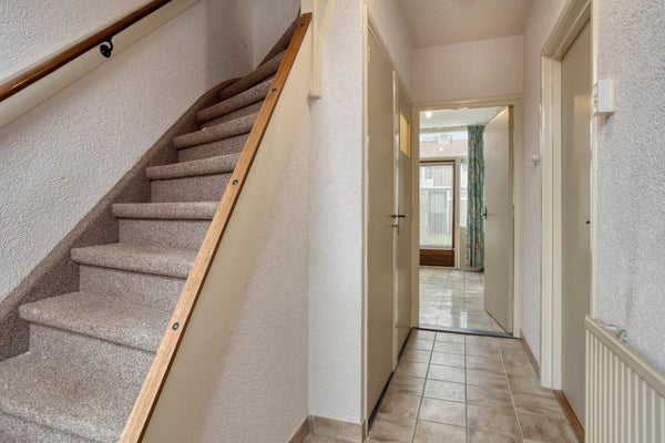 Via de voordeur kom je binnen in de betegelde hal. Hier is ruimte voor een garderobe en biedt toegang tot de eerste verdieping, de meterkast met veel opbergruimte, toilet, woonkamer en keuken.