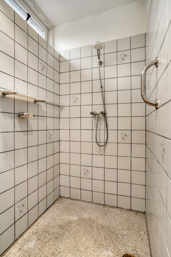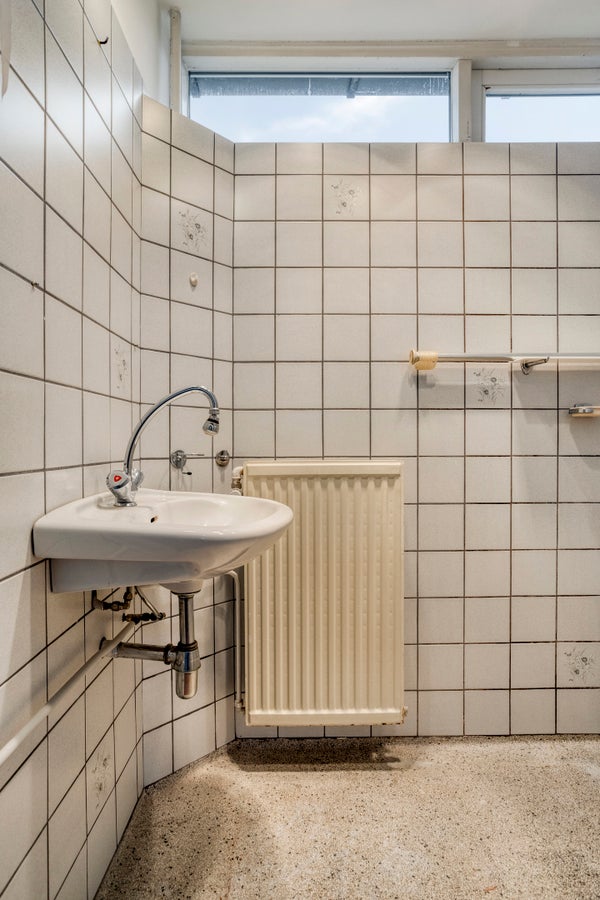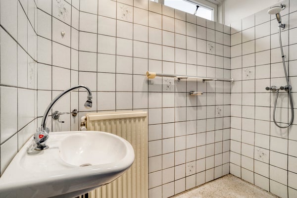 De badkamer is volledig betegeld en voorzien van een douche en wastafel. Er is een klapraam aanwezig voor natuurlijke ventilatie.