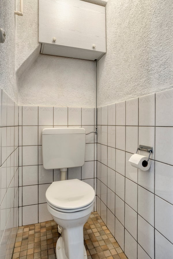 Staand toilet met opbergkast. De vloer is betegeld en de wanden half betegeld.