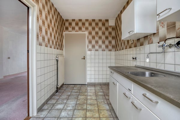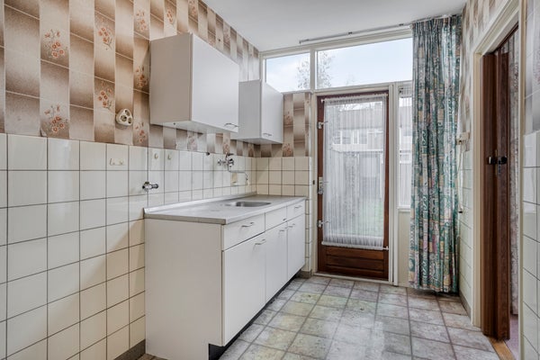De volledig betegelde rechte keuken is voorzien van een keukenblok met boven- en onderkasten en een spoelbak. Via een loopdeur is er toegang tot de achtertuin.