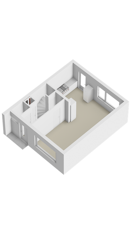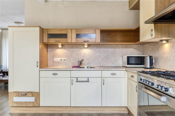 De woonkamer met doorzon-indeling ontvangt veel daglicht door de grote raampartijen aan de voor- en achterzijde. Aan de achterzijde van de begane grond bevindt zich de open keuken. Deze is eenvoudig ingericht, maar biedt een goede basis voor een moderne upgrade. Vanuit de keuken is er toegang tot de achtertuin.