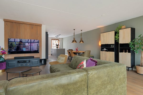 Via de verzorgde entree aan de voorzijde van de woning bereik je de entreehal met meterkast, modern toilet en trapopgang. De tuingerichte woonkamer is breed, licht en biedt volop ruimte voor een royale zit- en eethoek. Grote raampartijen geven mooi zicht op de tuin. De gehele begane grond is voorzien van een fraaie houten vloer, wat zorgt voor een warme en sfeervolle uitstraling.