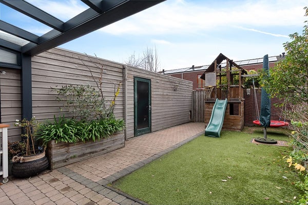 Via een grote pui stap je de zonnige achtertuin in. Direct aan de woning ligt een fijn terras, dat volledig is overkapt, waardoor je al vroeg in het seizoen buiten kunt zitten.