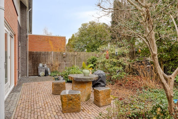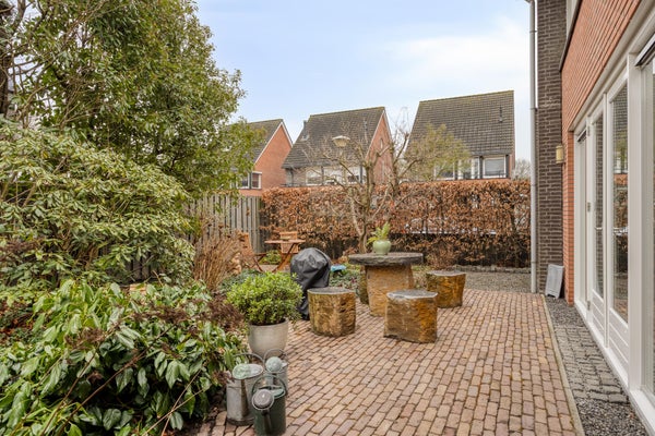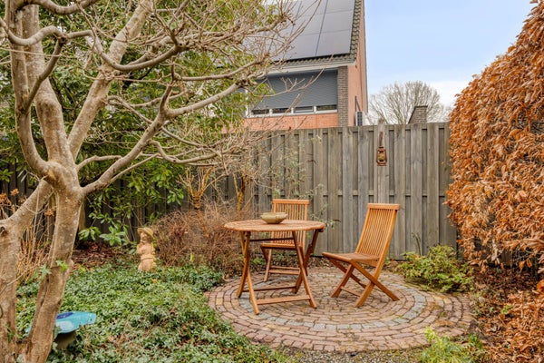 De brede achtertuin is verzorgd aangelegd met terrassen, beplantingsvakken, een buitenkraan, elektra en verlichting. Een fijne, groene en privacyvolle buitenruimte waar je in alle rust kunt genieten van het buitenleven.