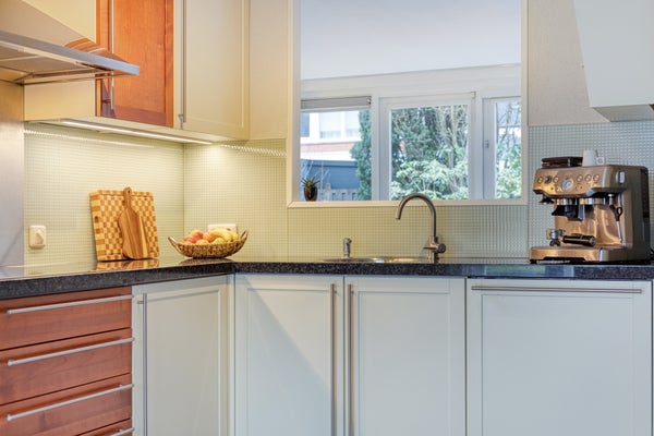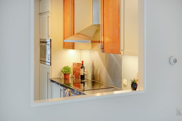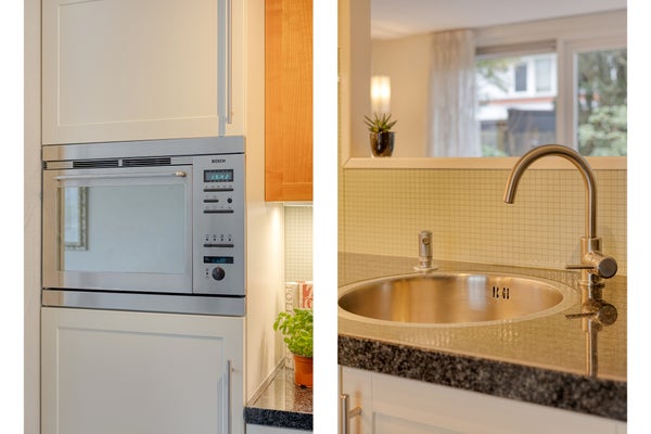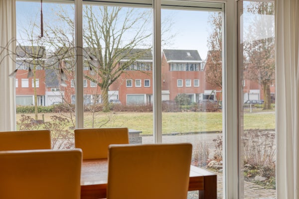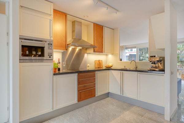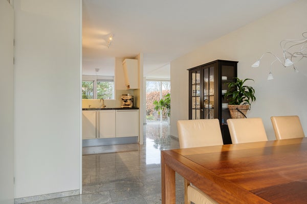 Aan de voorzijde van de woning bevindt zich het royale, lichte open eetgedeelte met grote kamerhoge ramen en een elektrisch screen. Hier geniet je van een prachtig vrij uitzicht op het groen en is er meer dan voldoende ruimte voor een gezellige eethoek. De nette L-vormige keukeninstallatie is voorzien van diverse kastruimte, een granieten werkblad, ronde rvs spoelbak en inbouwapparatuur zoals: een koelkast, combi-oven, inductiekookplaat, afzuigkap en vaatwasser. Een leuk doorkijkje verbindt de keuken met het zitgedeelte.