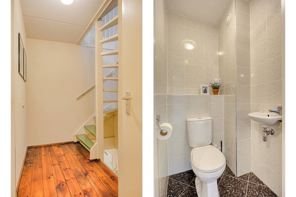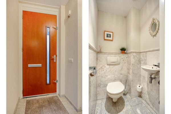 Via de verzorgde voor- en zijtuin met beplanting bereik je de overdekte entree. Op de eigen oprit heb je parkeerruimte voor 1 auto en de elektrisch bedienbare houten kanteldeur geeft toegang tot de inpandige garage. In de hal vind je de meterkast, een praktische bergkast met provisieruimte, de trapopgang en een gedeeltelijk betegelde toiletruimte met wandcloset en fonteintje. De inpandige garage is zowel vanuit de hal als via de voor- en achtertuin bereikbaar en biedt naast parkeergelegenheid ook volop bergruimte.