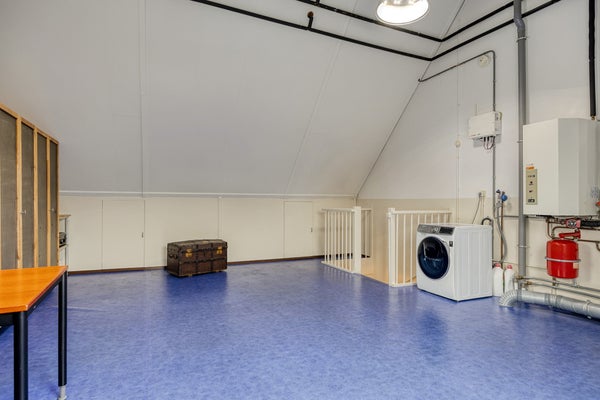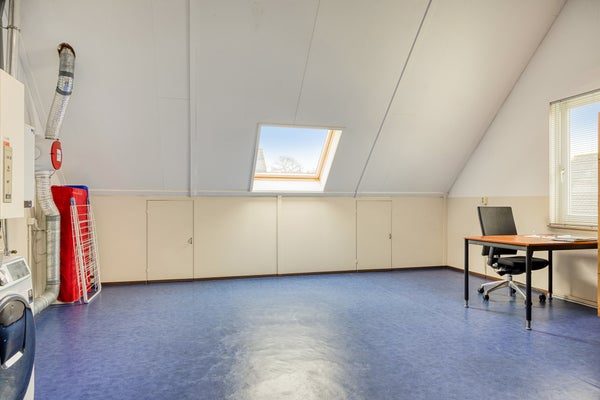 Op deze verdieping bevindt zich een grote, open zolderruimte die uitermate geschikt is voor het realiseren van 1 of zelfs 2 extra slaapkamers. Daarnaast zijn hier twee ramen aanwezig, aansluitingen voor wasapparatuur, de omvormer van de zonnepanelen, de cv-ketel (Intergas), zonneboiler en de unit voor mechanische ventilatie. Achter de knieschotten is aan beide zijden extra bergruimte aanwezig.