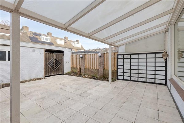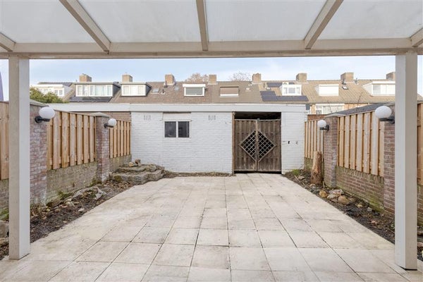 Het verhaal van deze woning is niet compleet zonder de fijne buitenruimte te benoemen. De achtertuin is volledig gericht op gemak, met een mooie overkapping waar je het hele jaar door kunt genieten. Met een vrijstaande stenen berging met elektra en een vrije achterom is ook praktische opslag en bereikbaarheid goed geregeld.