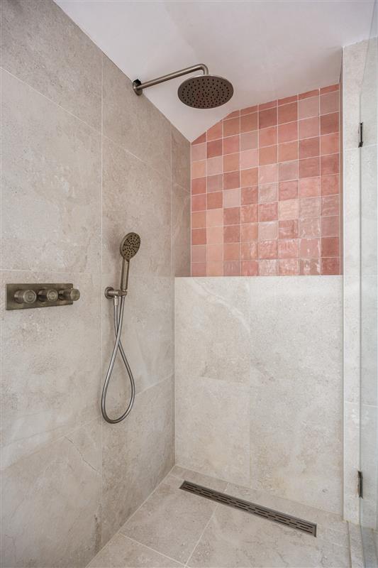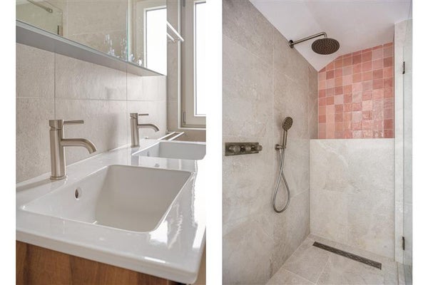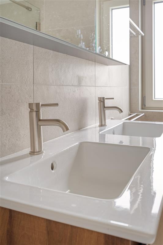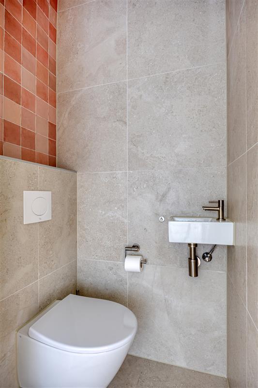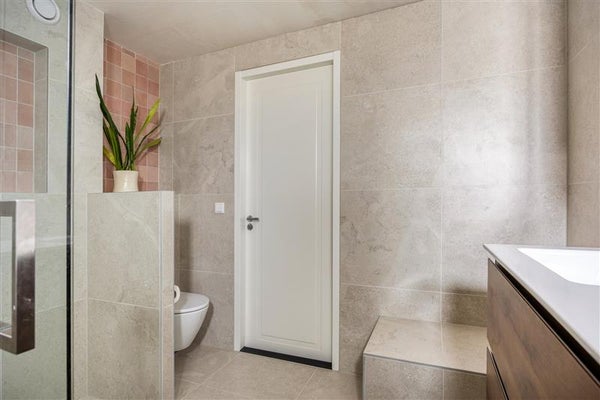 Badkamer met inloopdouche, toilet en dubbele wastafel