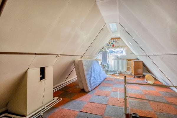 Via een vlizotrap is de zolder bereikbaar. Deze is ruim, voorzien van daglicht via ramen, vloerafwerking met tapijt tegels, een cv-ketel en een inbouwkast. De ruimte kan eventueel worden omgebouwd tot extra slaapkamer of werkkamer.