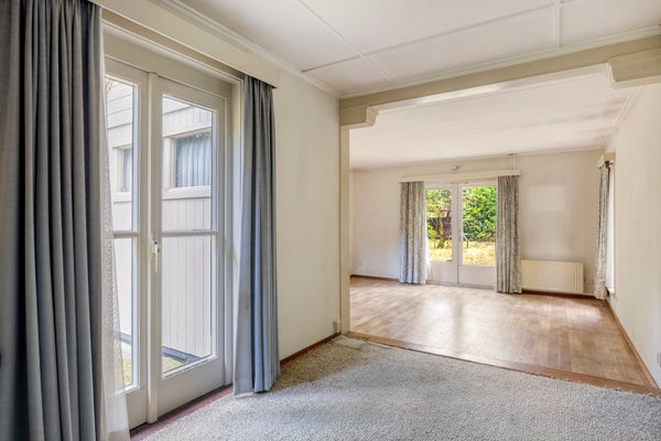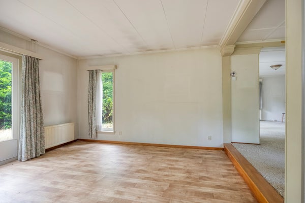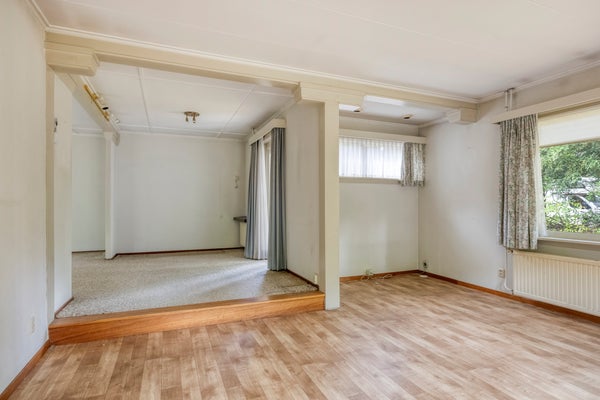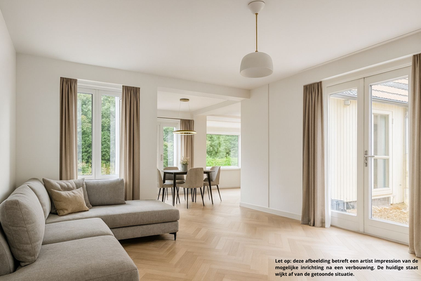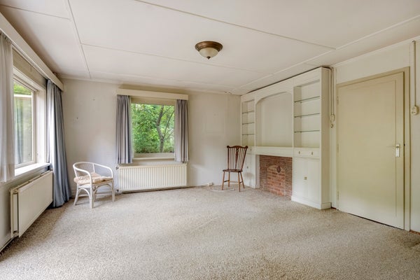 De woonkamer is ruim opgezet met veel ramen en maar liefst drie openslaande deuren naar de tuin. Er is een zitkuil en voldoende plek voor een grote eethoek. Bij de (gesloten) haard is een inbouwkast aanwezig. De vloer is deels tapijt, deels voorzien van houtlook zeil.