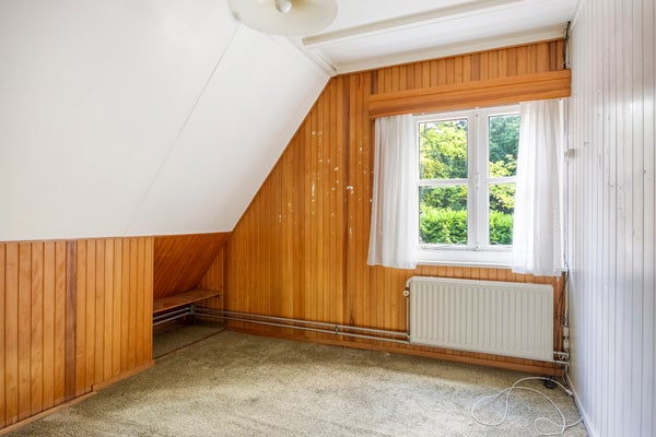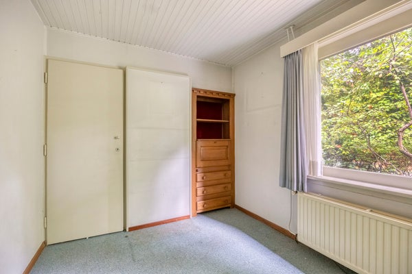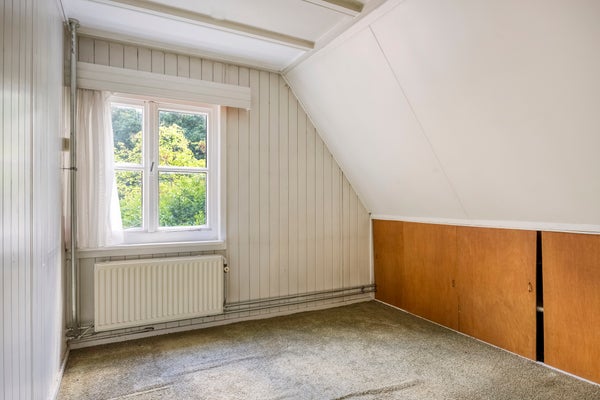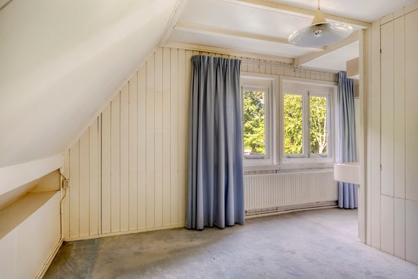 Deze bevindt zich aan de linker achterzijde, met zicht op de tuin, schuine wanden met opbergruimte, inbouwkast en tapijt.