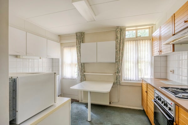 De gesloten keuken is eenvoudig, met kasten aan beide zijden van de ruimte, inbouwapparatuur en een diepe trapkast. Via een deur en een openslaand raam is ook hier toegang tot de tuin.