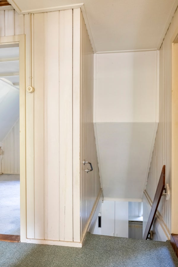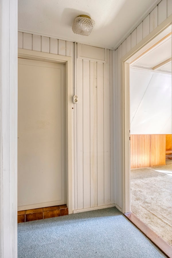 De overloop biedt toegang tot drie slaapkamers, een badkamer, een inbouwkast en de vlizotrap naar de zolder.
