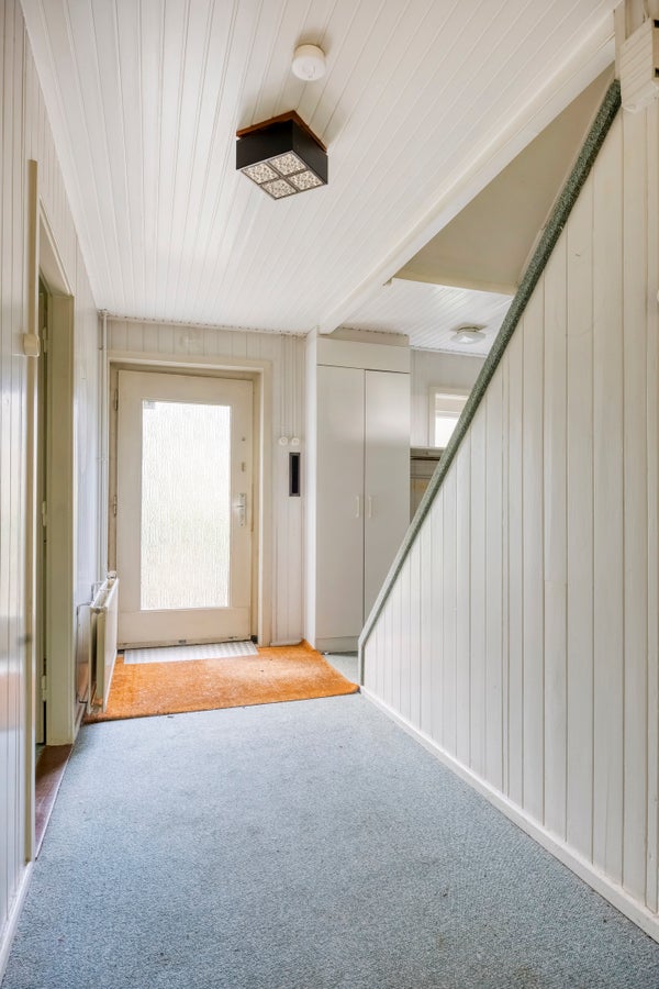 Via de groene voortuin kom je binnen in een ruime hal met tapijt. Hier bevinden zich de meterkast, het toilet (staand closet, fonteintje, raam), een trap naar de eerste verdieping, een vaste kast, en de toegang tot de woonkamer, keuken en een slaapkamer op de begane grond.