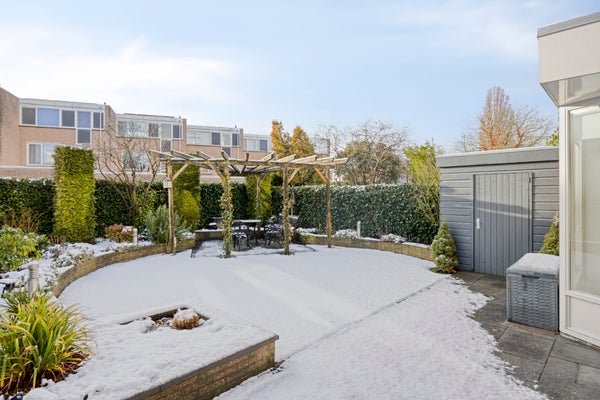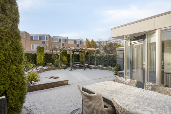 De modern aangelegde achtertuin beschikt over twee terrassen, kunstgras, borders met beplanting, een pergola en een elektrische luifel. Verder zijn er een houten berging, buitenkraan en buitenelektra aanwezig. Een heerlijke plek om in alle seizoenen van te genieten.