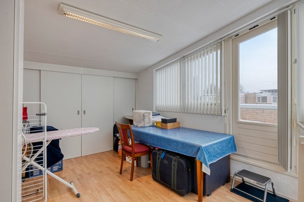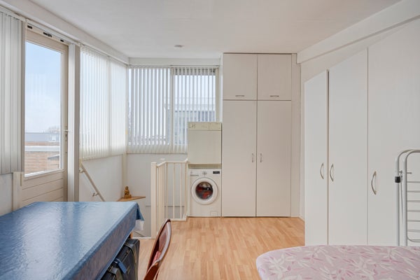 De tweede verdieping biedt een voorzolder en een royale, open multifunctionele ruimte met aansluiting voor de wasmachine, een schuifkastenwand en een deur naar het dakterras. Een ideale plek voor hobby, werk of ontspanning. Daarnaast is er een vaste kastenwand met wastafel en de opstelling van de cv-ketel.