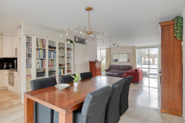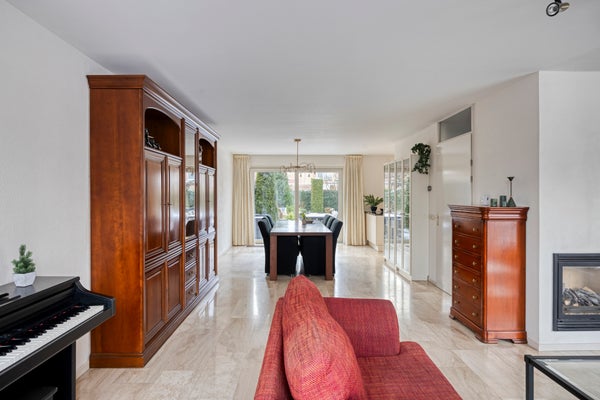 De riante L-vormige living biedt volop ruimte voor een gezellige zit- en eethoek en beschikt over een sfeervolle gashaard. Via de schuifpui is er direct toegang tot het terras en de fraai aangelegde achtertuin. De gehele begane grond is afgewerkt met een stijlvolle Italiaanse marmeren vloer met vloerverwarming (m.u.v. de aangebouwde bijkeuken).