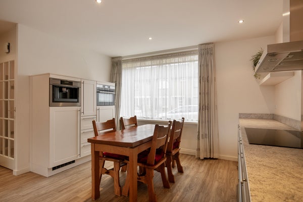 De woonkamer is door de aanbouw over de volledige breedte opvallend royaal (circa 11,5 meter diep). Aan de achterzijde zorgen de grote raampartijen en de extra deur naar de tuin voor veel lichtinval en een prettige verbinding met buiten. Er is meer dan voldoende ruimte voor een ruime zithoek én een volwaardige eethoek.