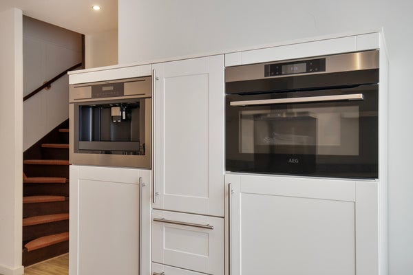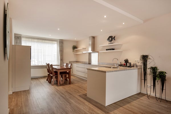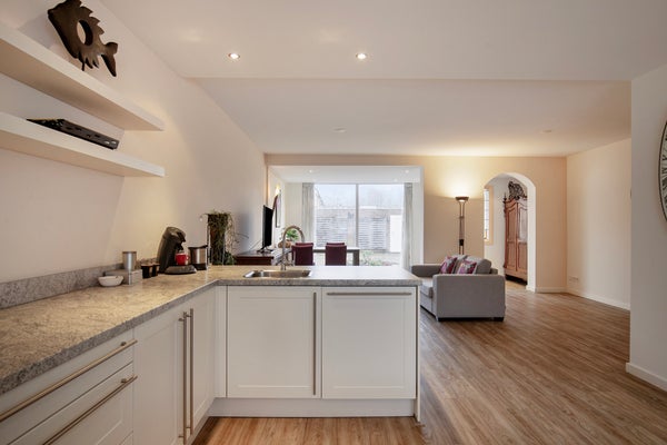 Aan de voorzijde bevindt zich de ruime, hoekopgestelde moderne keukeninrichting. Deze is praktisch opgezet met veel werk- en bergruimte en staat in open verbinding met de leefruimte.