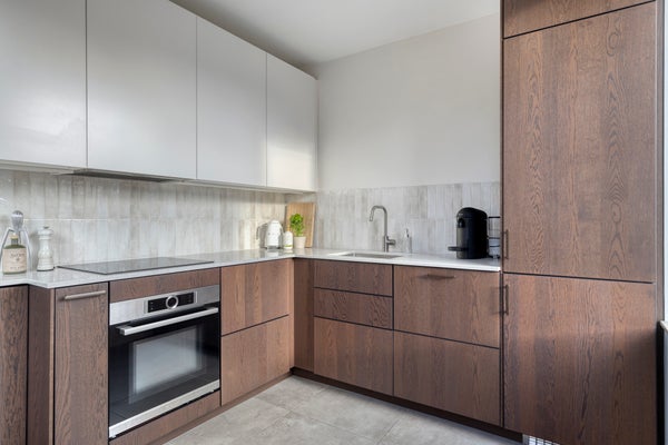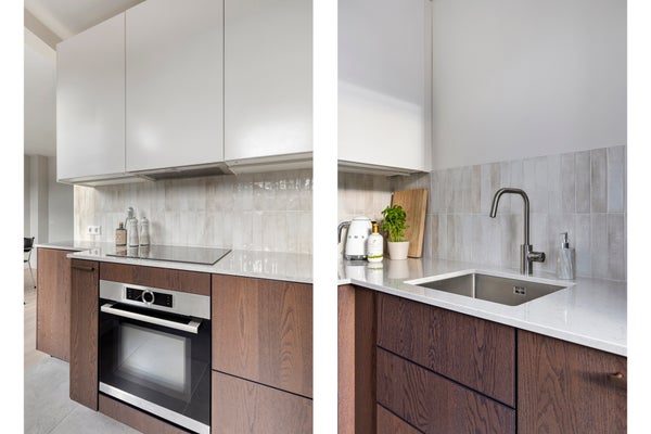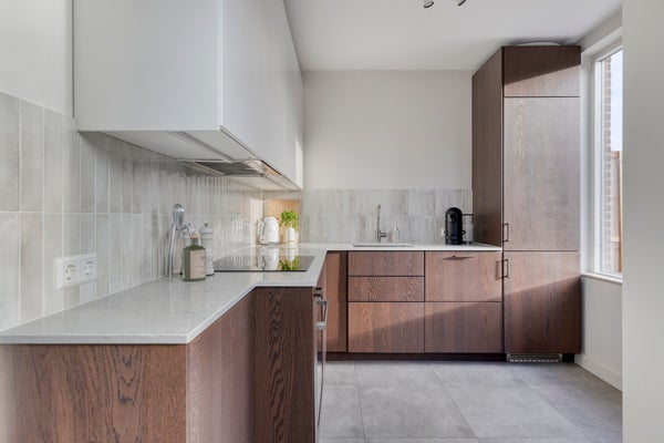 Aan de achterzijde ligt de volledig vernieuwde, moderne keuken, uitgevoerd met een stijlvol quartz werkblad en hoogwaardige Bosch inbouwapparatuur, waaronder een inductiekookplaat, vaatwasser, combi-oven en koel-/vriescombinatie. De keuken is strak vormgegeven, praktisch ingedeeld en afgewerkt met keramische vloertegels. Vanuit hier is er direct toegang tot de tuin.