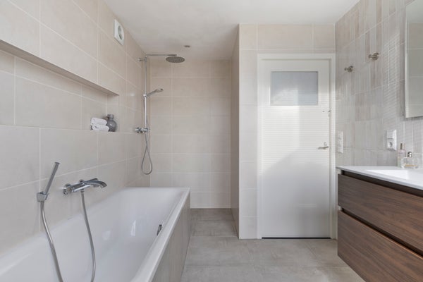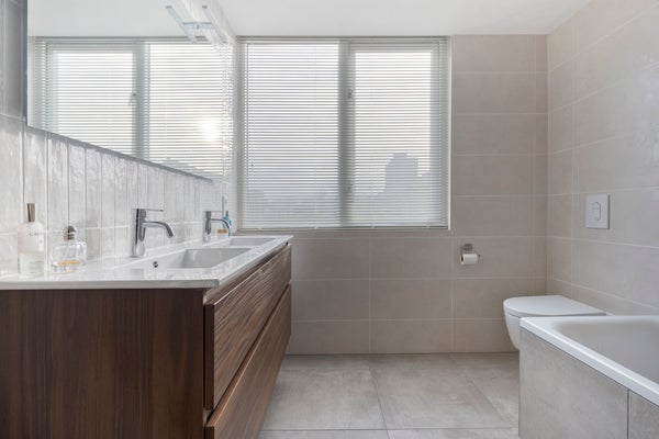 De volledig nieuwe badkamer (2024) is een echte eyecatcher en uitgevoerd met hoogwaardige materialen. Deze moderne spa- ruimte beschikt over een fraai wastafelmeubel met dubbele wastafel, een ligbad met handdouche, een ruime inloopdouche (met regendouche én extra handdouche), een tweede toilet en vloerverwarming. Een sfeervolle, praktische nis met geïntegreerde verlichting biedt ruimte voor accessoires en benadrukt het luxe karakter.