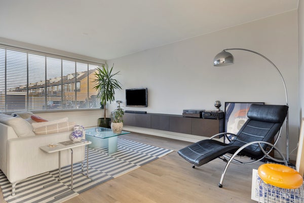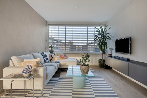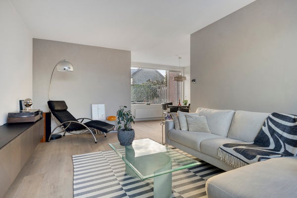 De royale living is licht, strak en modern afgewerkt en voorzien van een hoogwaardige pvc-vloer. Aan de voorzijde zijn nieuwe houten jaloezieën geplaatst die zorgen voor privacy én sfeer. De zwarte glazen deur geeft de ruimte een eigentijdse uitstraling en aan de achterzijde bevindt zich zonwering met een automatische schakelaar: ideaal voor warme dagen. Een ventilatieraampje zorgt voor extra comfort.