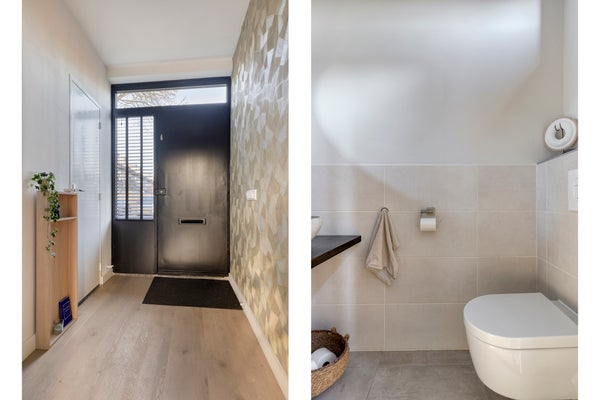 Via de stijlvolle entree betreed je de woning. Hier valt direct de hoogwaardige afwerking op: moderne wandafwerking, nieuwe vloerbedekking op de trap, nieuwe radiatoren en een praktische opbergkastruimte met vernieuwde meterkast. De nieuwe toiletruimte is luxe uitgevoerd en voorzien van vloerverwarming.