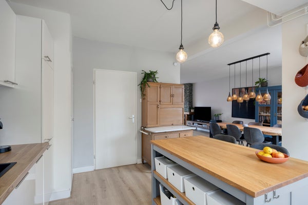 De open keuken (vernieuwd in 2021) is modern uitgevoerd en beschikt over diverse inbouwapparatuur zoals 4-pits gaskookplaat, afzuigkap, oven, vaatwasser, alsmede een extra werk-/ziteiland. Een praktische opstelling met voldoende werk- en bergruimte.