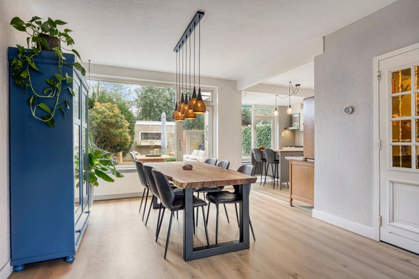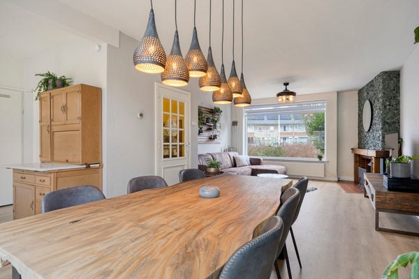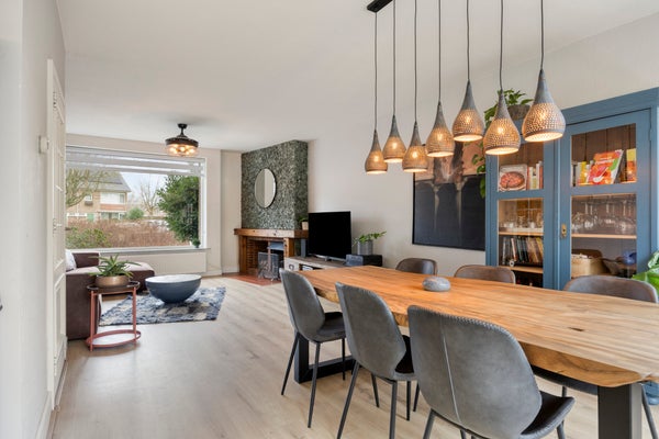 De living is opvallend ruim en profiteert van veel lichtinval door de grote raampartijen aan voor- en achterzijde. Aan de voorzijde bevindt zich het zitgedeelte met een sfeervolle open haard; aan de achterzijde is plaats voor een royale eettafel met zicht op de tuin.