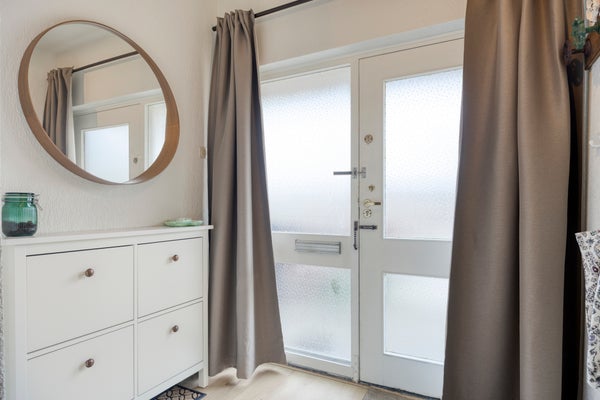 Via de overdekte entree bereikt u de hal met toiletruimte, trapopgang, meterkast en een vaste inbouwkastenwand.