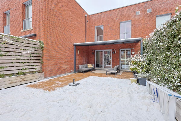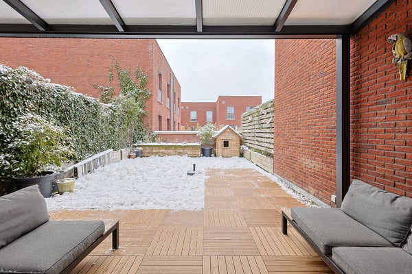 De buitenruimte ligt op het zuiden en is in 2025 opnieuw aangelegd. De combinatie van een composiet vlonder, kunstgras en volwassen beplanting zorgt voor een onderhoudsvriendelijk geheel. In 2022 is een overkapping geplaatst, voorzien van inbouwspots, waardoor deze ruimte ook ’s avonds prettig te gebruiken is.
